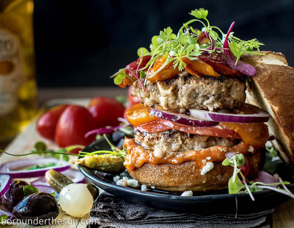 To assemble the burger I used more fresh red onion slices, more crumbled feta, micro greens and olives.